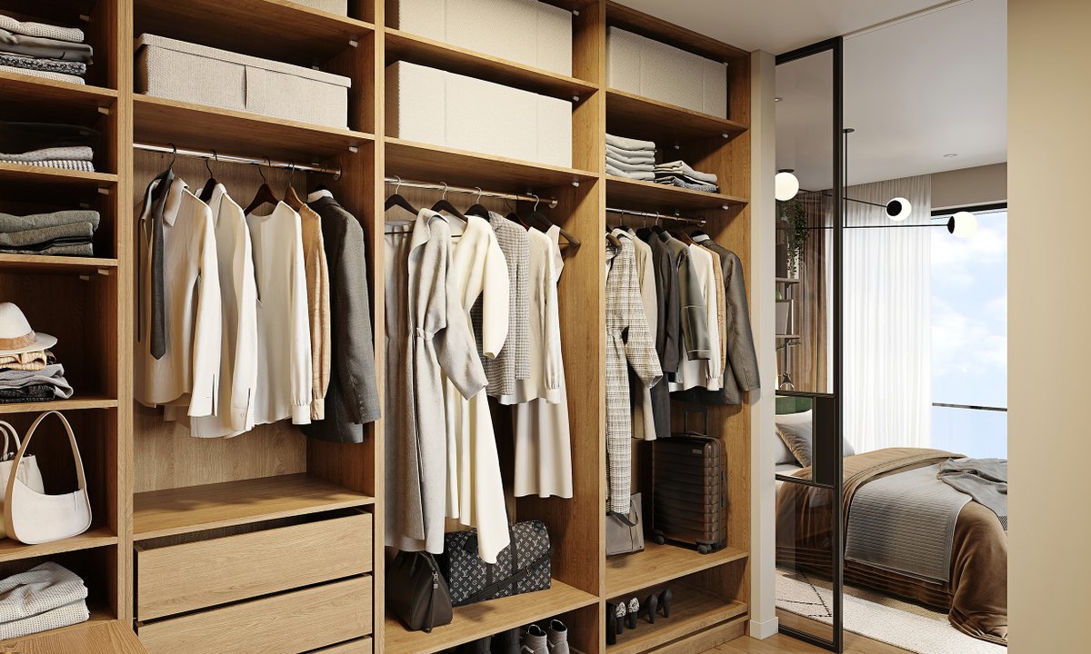 Для вашей одежды мы выделили отдельное помещение — гардеробную. Так мы экономим место на шкафах, ведь она вместит все ваши вещи, обувь и аксессуары. Если же гардеробная вам не нужна, помещение можно обустроить под другие цели, например, под творческую мастерскую.
