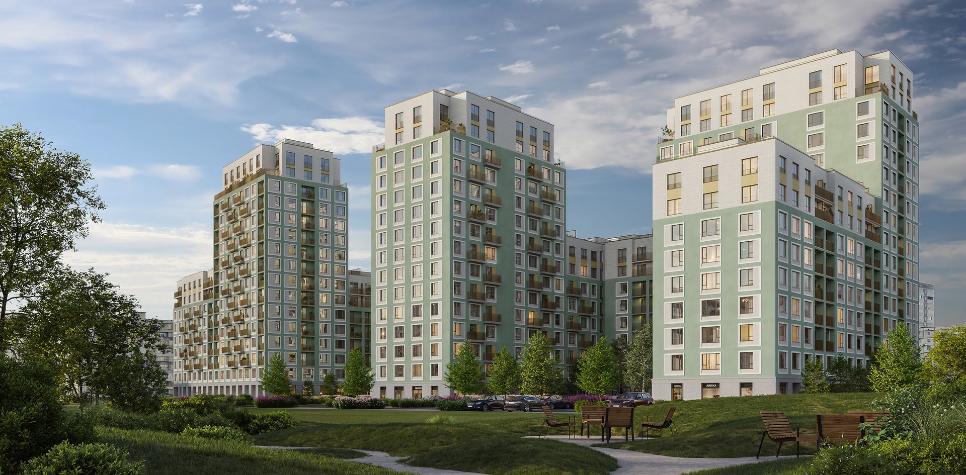 Квартал состоит из восьми домов. Вдоль улицы Аэропорт расположено 6-18-этажное здание с видовыми квартирами. Оно защищает внутреннее пространство от шума и пыли. В центре — четыре 7-9-этажные урбан-виллы. Для них характерны увеличенная площадь квартир, повышенная приватность и малое соседство (30 — 40 квартир). Завершают комплекс два полузакрытых блока высотой 8-16 с подземной парковкой. Благодаря переменной высотности застройка приобретает человеческий масштаб, и увеличивается число квартир, из которых открывается красивый вид. Первые этажи мы отдали под полезные сервисы и магазины. На территории «Авиатора» расположен многофункциональный спортивный комплекс с открытым амфитеатром.